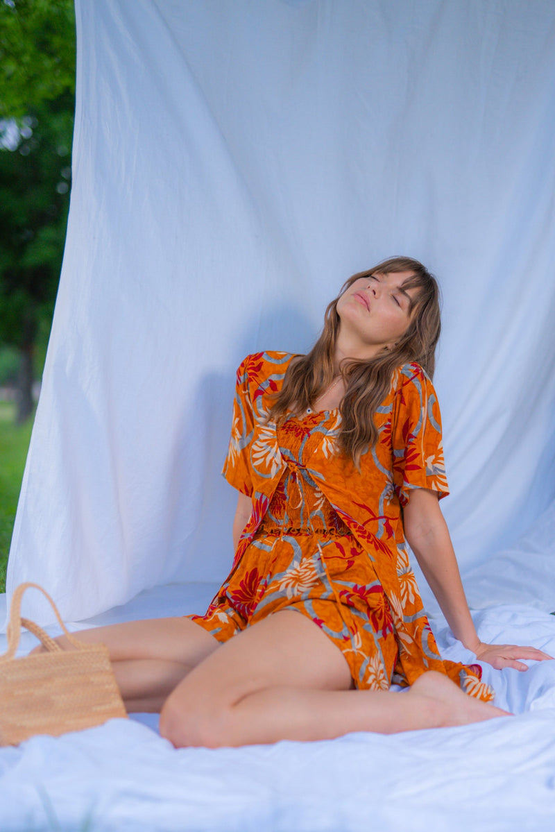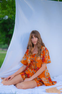 “Pavitra” means pure or sacred in Sanskrit—a name that honors the essence of this radiant set. With vivid florals blooming across a sun-drenched orange canvas, this piece feels like a celebration of joy, warmth, and wild beauty. Meant to evoke the glow of golden hour.